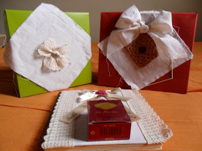 ...NÃO ESTOU COM MATERIAL EM CASA, O QUE EU TENHO É COLA BRANCA, UNS RETALHOS DE ALGODÃO, UM RESTINHO DE RENDINHA E DUAS CAIXINHAS, UMA DA NATURA E A OUTRA, ERA EMBALAGEM DE UMA BLUSA QUE A NAMORADA DO MEU FILHO DEU A ELE.