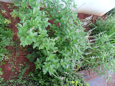 MEU MANJERICÃO AO PÉ DO GRANDE COQUEIRO,TODOS QUE VEM ME VISITAR ACABAM LEVANDO UM VASINHO DAS MUDINHAS QUE FAÇO.